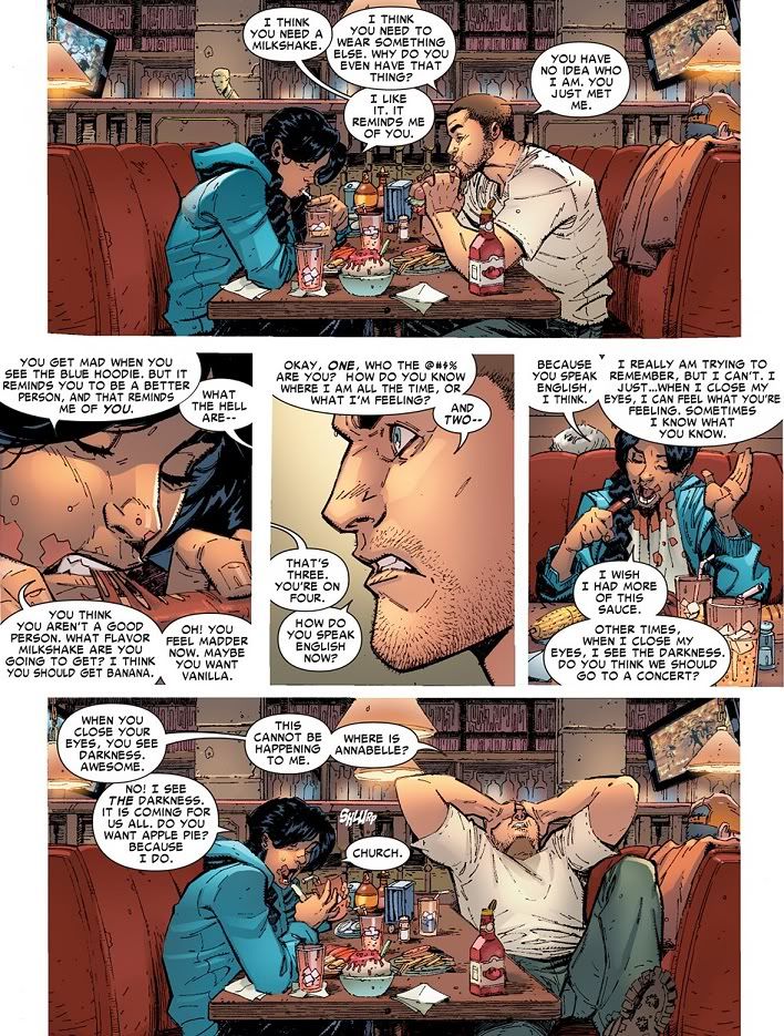 Before he can worry about it too much, Aracely suddenly appears on the sidewalk. She has this power now where she can feel Kaine and knows where he is, and it’s kind of weird. Still, he agrees to take her out for barbecue, where Aracely acts even weirder.