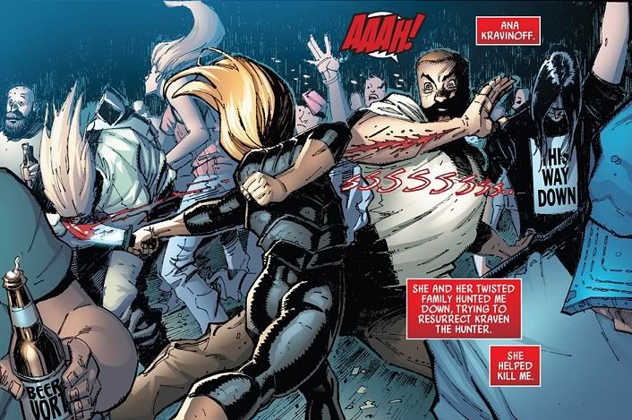 Anyway, Kaine has gone to her concert, which is being held in a church. He’s rather perturbed at what young people do for fun these days and considers leaving – until Ana Kravinoff shows up, the daughter of Kraven the Hunter. She was spying on him earlier in the issue. For those who don’t know, there was a big story in Amazing Spider-Man a few years ago where Kraven’s family tried to kill Peter Parker in order to resurrect the original Kraven. At the last minute, Kaine was exchanged for Peter without the Kravinoff family knowing. And since it was a clone that was sacrificed, Kraven came back to life all wonky and weird. Spider-Man eventually beat him and the family…and then the Jackal showed up in an epilogue and brought Kaine back to life.