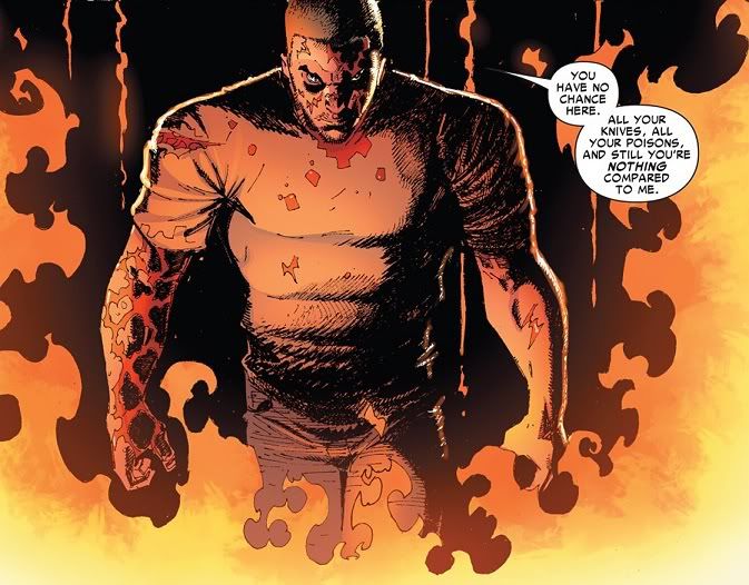 The fight ends when the fire damages the church enough that the whole place starts coming down, at least the insides. Ana offers some threat that Kraven is going to be hunting Kaine, but that doesn’t entice me very much. I suppose it will make for a cool issue someday in the future. But as of right now, meh. I’d rather something be established between Kaine and Ana. But the fight ends with her getting away and Kaine fleeing the church, all bloodied and stuff. Annabelle finds him and calls for help, but Kaine tells her he’ll be OK. Then he warns her to run away from him, that he doesn’t want to see her get hurt.