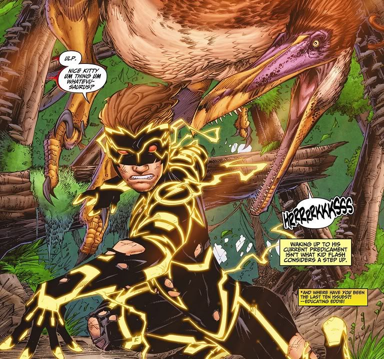 Elsewhere, Kid Flash is racing some dinosaurs, and Solstice is flying alongside him. She asks if this is what it feels like to just cut loose and enjoy one’s super-powers, considering Harvest had turned her powers into a curse. She seems to be stuck in this smokey black form, but I don’t think she’s ever had any teenage angst about her freaky look. This is a missed opportunity, as far as I’m concerned. Either let her look normal like everybody else or have her feel something about looking so freakish.
