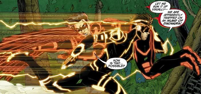 This reads like a case of a 40-something white guy whose spent his career writing superhero comics trying to write teenagers being teenagers. The fact that they’re dressed in colorful costumes and hanging out on an island filled with dinosaurs doesn’t help.