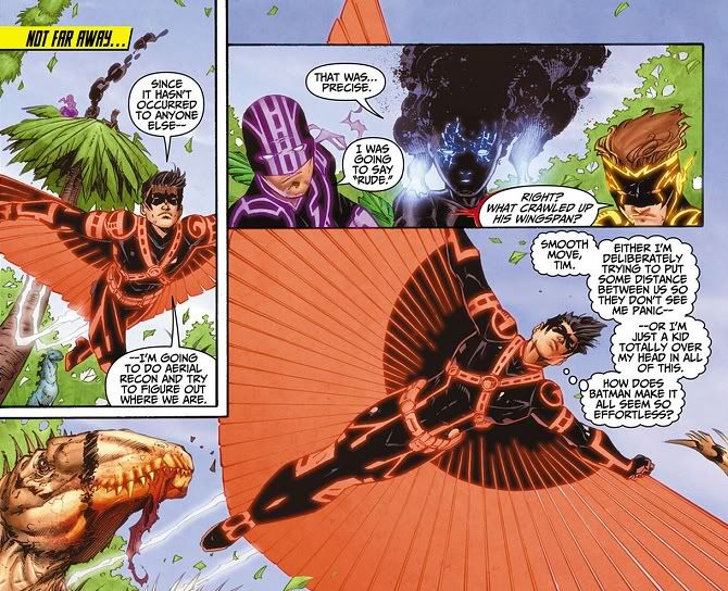 Back with the rest of the team, Red Robin takes a moment to make an ass of himself.