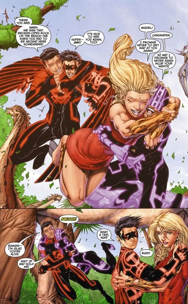 Bunker tells Red Robin that he needs to get over himself and be the leader that they need as a team. Red Robin put this band together, and they will follow him, but he needs to stop being a douchnozzle about it. Red Robin agrees and shows signs of calming down before he and Bunker are suddenly grabbed up for some superhero hugs by the returning Wonder Girl and Superboy!