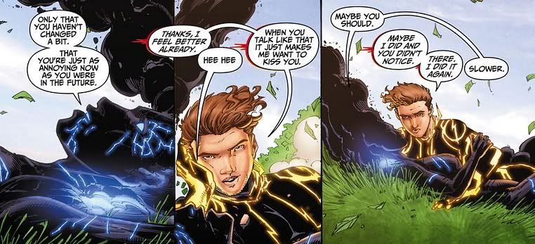 Maybe some other day. For now, the two fun-loving teens crash in the grass and just relax and shoot the breeze. This is the best scene in the book, event though they start talking about the fact that one of the Legion of Superheroes from the 31st century seemed to recognize Kid Flash. What could that mean? Solstice jokes with him, and we get an adorable scene between the two.
