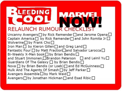 That is a hypothetical checklist put together by the website Bleeding Cool, based entirely on rumors they’ve heard. I trust them because Bleeding Cool knew all about Before Watchmen long before it was officially announced. Basically it throws out a few ideas about which writers and which artists might be taking over which books. Chief among these changes is the rumor that Brian Michael Bendis is leaving the Avengers comics to finally write X-Men, which he’s never done. We already know that Bendis is leaving the Avengers, that’s official. But he’s only been hinting at where he’ll go next.