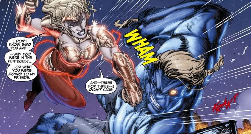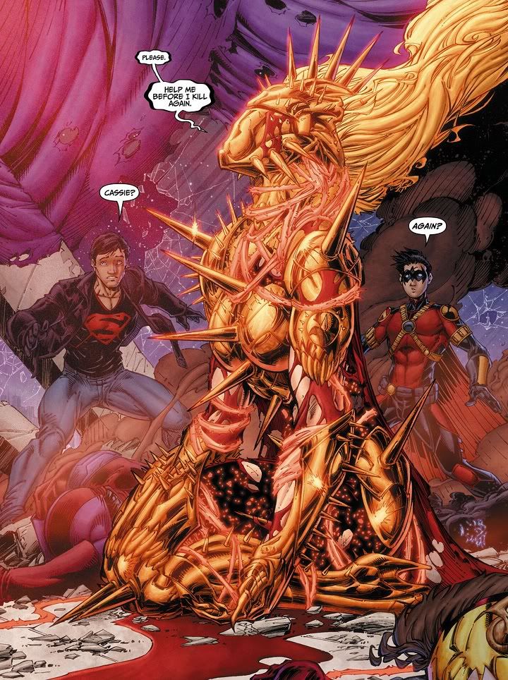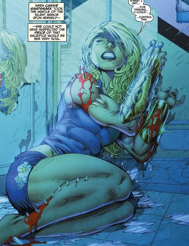 So anyway, it’s Kid Flash, Bunker and Solstice who fight Loose Cannon, until they’re joined by Wonder Girl, who kicks his ass and leaves him depowered out in the bay at the end of the fight. Then she depowers, her armor receding, and Wonder Girl says that she blacked out while using her powers. And that it’s happened before. Also, the first page of the comic was Cassie in the bathroom with her magic armor poking through her body.