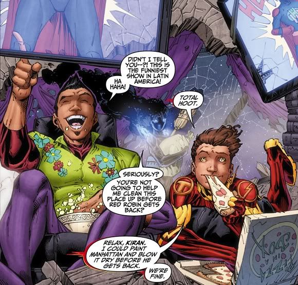 Then we get a scene that’s almost exactly what I want from this series: Bunker, Kid Flash and Solstice hanging out, watching TV and eating pizza. It’s just that they do it in costume and in a debris-filled apartment. Things just won’t be normal for these kids.