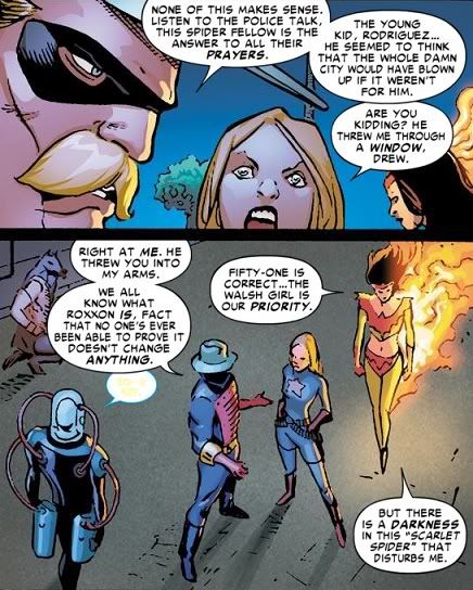 Back at the office, the cops have arrived and are taking Walsh’s statement. He wants the Scarlet Spider arrested for trespassing, assault and corporate espionage. The officer is a little confused, since the cops really like Scarlet Spider. Even Texas Twister smells something fishy. Why would a superhero break into the office unless he had a reason? Twister points out to Walsh that nobody believes Roxxon is on the side of the angels. Still, Walsh points out that Scarlet Spider broke into his office and kidnapped his daughter!