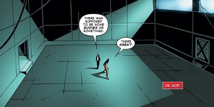 Zoe is convinced that there should be bodies, but Scarlet Spider starts freaking out that he really is the bad guy here. He’s beat up a ton of people and broken into several buildings, all for nothing! He has done messed up badly. Now everybody’s going to know where he is, and he was trying to run to Mexico to get away.