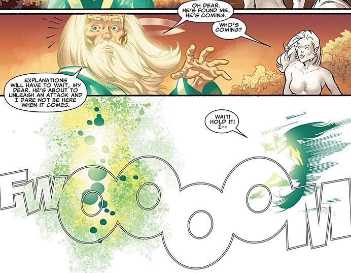 High above him, the white wolf Vanora is watching. Vanora is Wolfsbane’s daughter from another dimension. She was brought to Earth through a variety of means, and she’s being led by the elder Damian Tryp, who is part of some bigger storyline that PAD is writing. Tryp brought Vanora here to help her brother Tier…at least I think that’s why they’re there. Tryp would explain more, except somebody is about to launch an attack and he disappears in a burst of energy. This has been Tryp’s M.O. for several issues now. He’s got this big mystery going, but PAD hasn’t revealed even the tiniest hint of what’s happening. At this point, it’s just annoying. A good mystery stays interesting when you tease the eventual outcome. Saying that some mystery person is launching an attack does not tease anything. Especially since this is the first we’ve heard that somebody is searching for Tryp and would attack him.