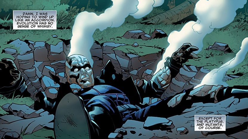 Let me introduce you to Darwin, one of the main characters in this issue. Darwin used to be a member of X-Factor, but PAD shuffled him off into limbo all the way back in X-Factor #214. Not even PAD could figure out what to do with Darwin, he’s that terrible of a character. Darwin, real name Armando Munoz, has the mutant ability to adapt his body to survive any situation. He evolves instantaneously. You may remember him from a brief appearance in the movie X-Men: First Class. He was the black guy who died first.