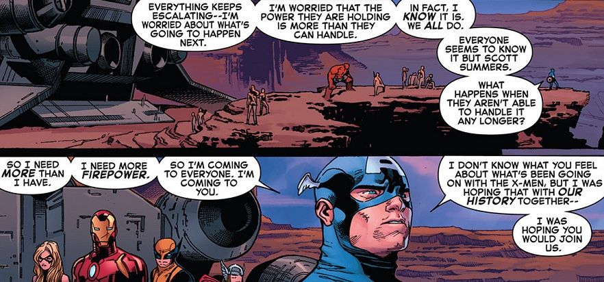 Look at Cap’s line right there: “I’m worried that the power they’re holding is more than they can handle. In fact, I know it is. We all do. Everyone seems to know it but Scott Summers. What happens when they aren’t able to handle it any longer?”