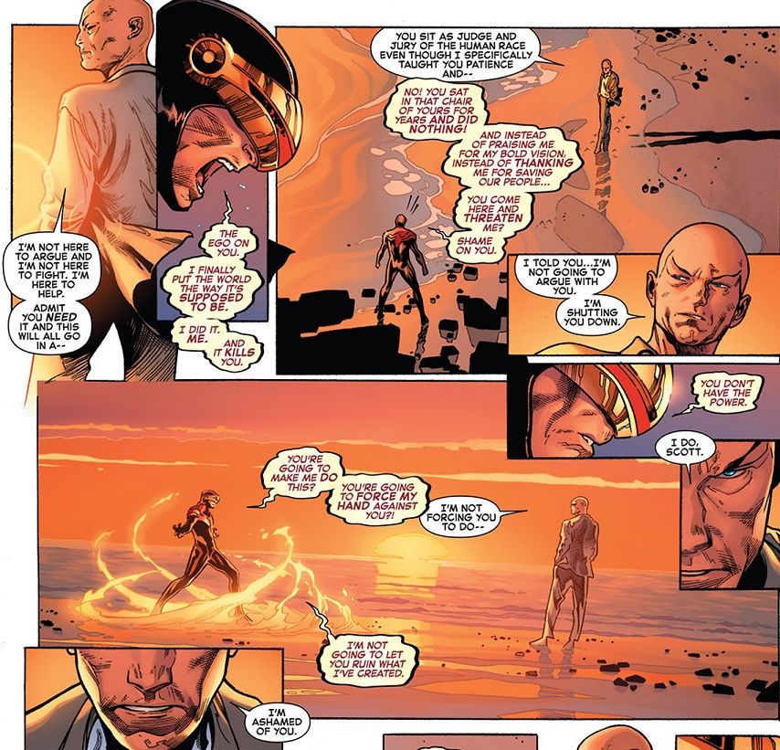 Then Xavier shows up standing on the beach, and Cyclops goes out to meet him – though Cyclops is already a little on edge. Xavier tells Cyclops that he’s there to shut him down. And this is where I get a little annoyed, because Xavier acts as if it’s Cyclops who has been the evil one, and not the Phoenix influencing Cyclops. They have a pretty great argument, even if Cyclops is sounding crazy and Xavier is being a jerk.