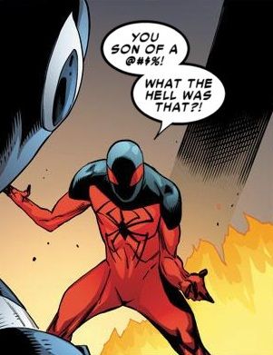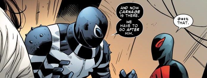 The two back off from killing each other and introduce themselves rather angrily, though they both know the other. Venom recognizes Scarlet Spider from the Spider Island story from last year, and Kaine knows Venom from the past. Kaine is especially pissed, dropping F-bombs like they were punctuation. He feels guilty about everyone in the Space Center getting killed because he couldn’t stop Carnage.