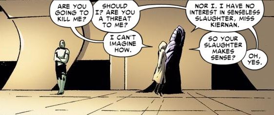 Then, for some reason, Radu goes on a walk with Kiernan. He equates being a reporter with being a historian, and he doesn’t see her as a threat, so Marquis Radu decides to give Kiernan (and the reader) an exposition dump about his master plan. Because why not.