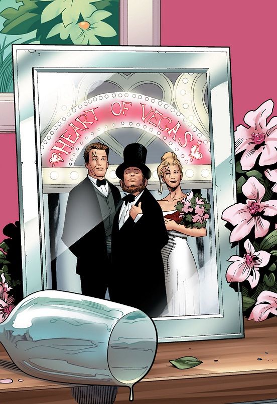 If you’re just joining us, Jamie Madrox and Layla Miller ran off to get married a few issues ago, a very sudden and spontaneous decision. They’ve been sleeping together for awhile now, and that’s a good enough reason to get married in this day and age! So they raced off to Las Vegas and got quickie hitched by a guy dressed as Abraham Lincoln.