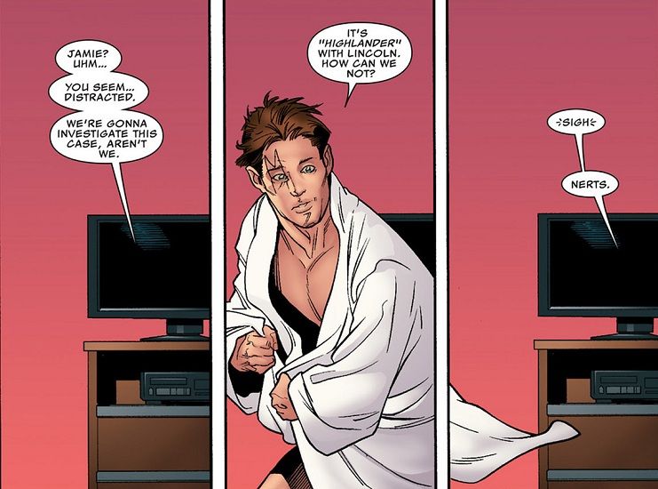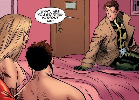 Madrox and Layla are spending their honeymoon in a very pink room, complete with heart-shaped bed, Champagne and all the usual festivities. They’re lying in bed together when they’re woken up by a knock at the door. Madrox pulls a gun out from underneath his pillow, since he knows that in one parallel dimension, he and Layla were murdered on their wedding night. But it’s just the cops. Turns out that the Lincoln who married them has been murdered, and they were some of the last two people to see him alive. The cop also discovered that they’re private investigators, so he’s wondering if they’d be willing to lend a hand or saw anything suspicious.
