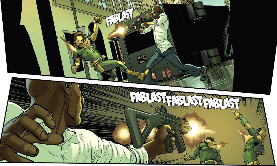 The issue opens with a quick splash page recap to get us up to speed. President Captain America led a team of superheroes into battle against HYDRA, and during the scuffle, Miles saved Captain America from one of the War Machine soldiers.