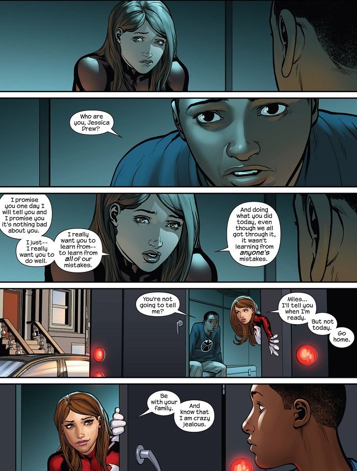 Miles and Spider-Woman share a moment in the back of a SHIELD van where she gives him a cover story for where he’s been, but all Miles wants is to know more about her. First she was annoyed by him, now she’s being friendly and protective. What’s her deal? Who is she? But Spider-Woman can’t bring herself to tell him.