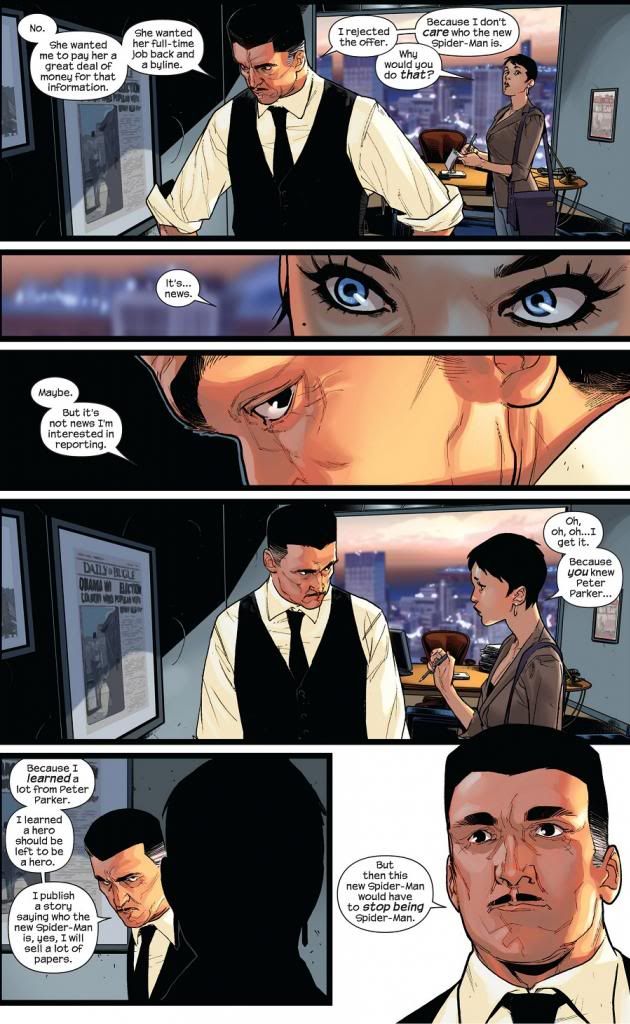 Speaking of JJJ, he has a nice scene in this issue, but it’s not as powerful as I was hoping it might be. Towards the end of the Peter Parker series, Bendis was doing some amazing things with Jameson. I have always preferred the respectable newsman version of Jameson as opposed to the raving lunatic Jameson. Like in the first Spider-Man movie, when he refused to tell Green Goblin who sells him the pictures of Spider-Man. And that version of Jameson has always been around in the Ultimate Universe. Towards the end, Jameson had come over on Peter Parker’s side, knowing the truth about the young hero’s identity and doing everything in his power to help him. It was a great storyline…