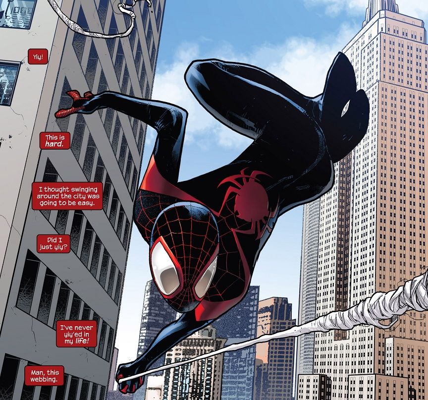 This issue picks up with Miles swinging around New York City, trying to get the hang of web-slinging.