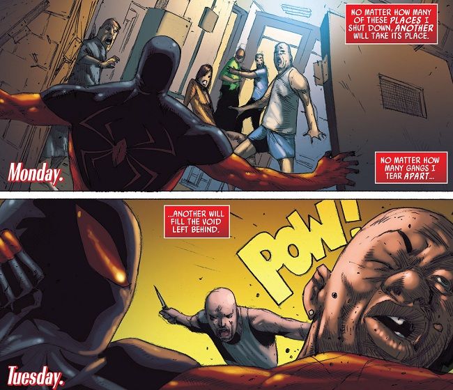 We cut to Kaine still investigating human trafficking. He narrates us through a scenario where a 13-year-old girl has been delivered to United States with a promise of a bright future – only to find out she’s actually being sold as a sex slave to some fat pervert. Raped, drugged, turned into a prostitute…or at least that’s what would happen if Scarlet Spider didn’t get involved. And he just keeps getting involved. Kaine kicks the guy’s ass, while at the same time realizes that the girl isn’t running. She doesn’t have anywhere to go. She’s an illegal immigrant. The only people she knows in America are the perverts who bought her. Kaine gives her some money and drops her off at the church, lamenting the fact that she’ll probably just get deported.