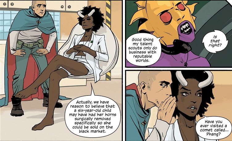 No Brian K. Vaughn, why would you do this to us? You take two issues to really get the momentum going on Marko, Alana and their family, only to suddenly throw us this curveball with an entire issuing focusing on The Will? What the heck, man? I like The Will as much as the next reader. And Gwendolyn seems cool. But their stories could have waited until you were done rocking our socks off with the real stars of this comic. I was in no rush to watch The Will rescue that little girl from Sextillion. That could have happened at any time. But not in the middle of you delivering some of the best characterization in this series to date.