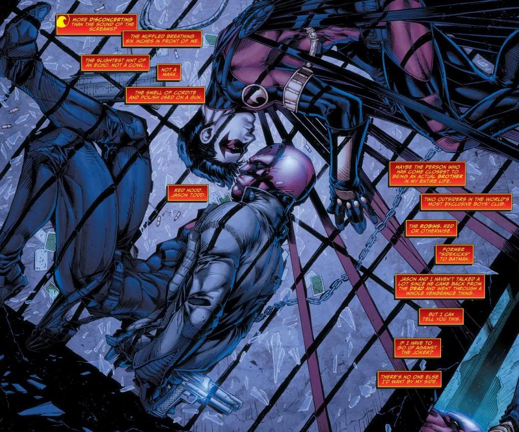 Red Robin and Red Hood are unconscious on the floor of whatever hideout the Joker has them trapped. Red Robin wakes up and pretends to still be out of it so that he can assess his situation. He figures out the Red Hood is with him due to the smell of gunpowder and the labored breathing behind the helmet. He also starts to piece together the Joker’s trap.
