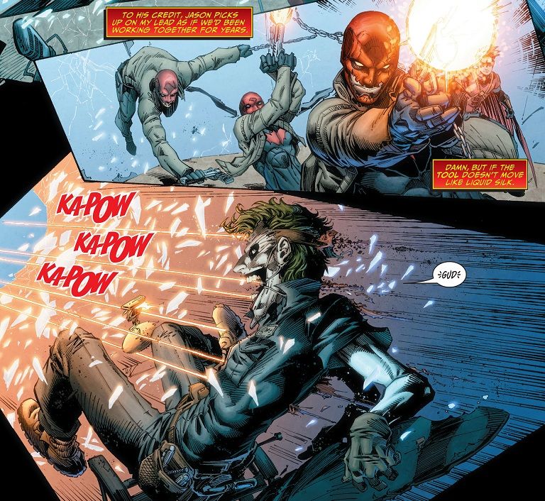 Red Robin and Red Hood are fairly evenly matched, with each one getting in some good hits. In the end, though, it’s Red Robin who gets the advantage (yes!) and holds Jason Todd at his mercy. Red Robin wonders if he has what it takes to become a killer if it means saving a life…Nope, he doesn’t. The two enact a last second plan, using the near-killing to distract the Joker so that Jason Todd can open fire on the Clown Prince of Crime.