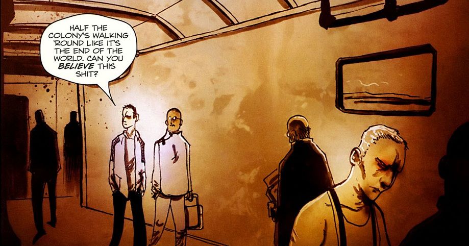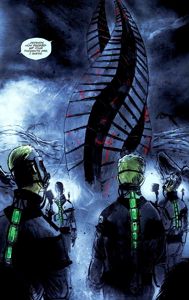 The art by Ben Templesmith takes a little getting used to at first, but it grew on me by the end of the story. I tend to like clean, detailed artwork in my comics, but Templesmith clearly has a style all his own. The art is a very serious kind of cartoony, with characters drawn more as sketches than as actual people. It definitely works in creating a certain mood for the series. And once the story picks up near the end, the art is a strength. The colors are washed out and rarely solid, but like I said, it becomes a strength of the story towards the end, when Aegis VII descends into deadly chaos. Sometimes, though, it was a struggle to tell certain characters apart, especially the women. Most of the male characters had something distinctive about them to tell them apart, but the women were all females with similar long hair.