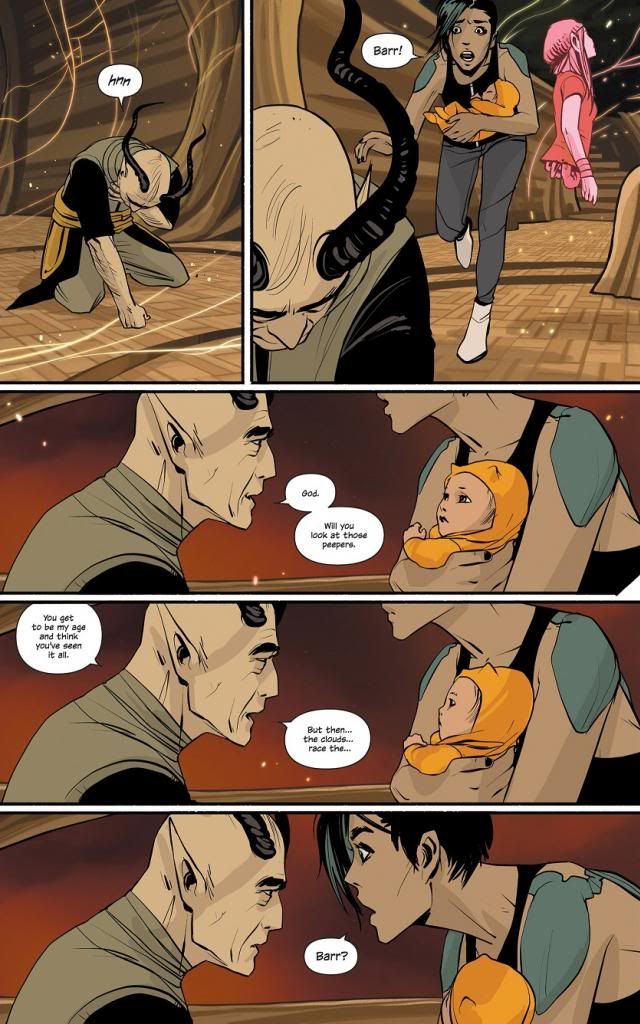 But, like I said, having that entire flashback in a foreign language really damaged the emotional impact. Rather than being sad for Marko’s loss, I was left trying to figure out gibberish. Poor choice, in my opinion. This should have been a hugely emotional scene. Barr’s death came suddenly and with little warning, and Barr was cool enough for the reader to really feel the loss. But I think Vaughn fumbled the moment. At least Hazel’s narration to close out the issue really captures the reader back and ends the issue on a solid moment.