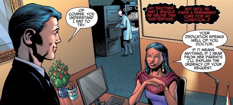 Anyway, the yacht sets sail and Red Robin explains their mission: they’re going to break into Belle Reve prison to rescue a teenage metahuman named Tabitha Munse, whom several government agencies are trying to figure out how to weaponize. Tim shows them a picture of the girl, and we get a slight breakdown in art and words. The picture is of the girl in some kind of combat pose with a blank yellow background, yet it prompts Solstice to worriedly ask who she’s fighting. We don’t see her fighting anyone. However, Red Robin switches to a picture of her opponent, whom he doesn’t know – but Solstice recognizes as Lance.