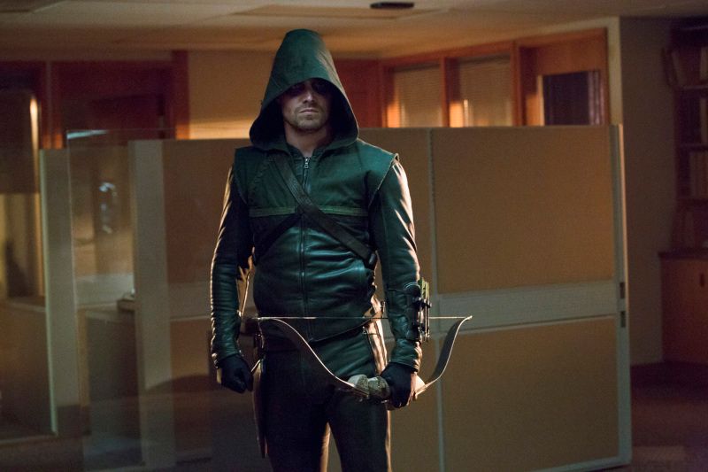 The problem is everything else to do with his identity. The costume is mostly fine, if unremarkable, but the real problem is that stupid faux-mask. People in real masks don’t look as good as they do in the comics, I get that, but Stephen Amell just looks terrible with that thick eyeshadow over his face. Whoever thought it was a good idea should be dragged out into the street and shot.