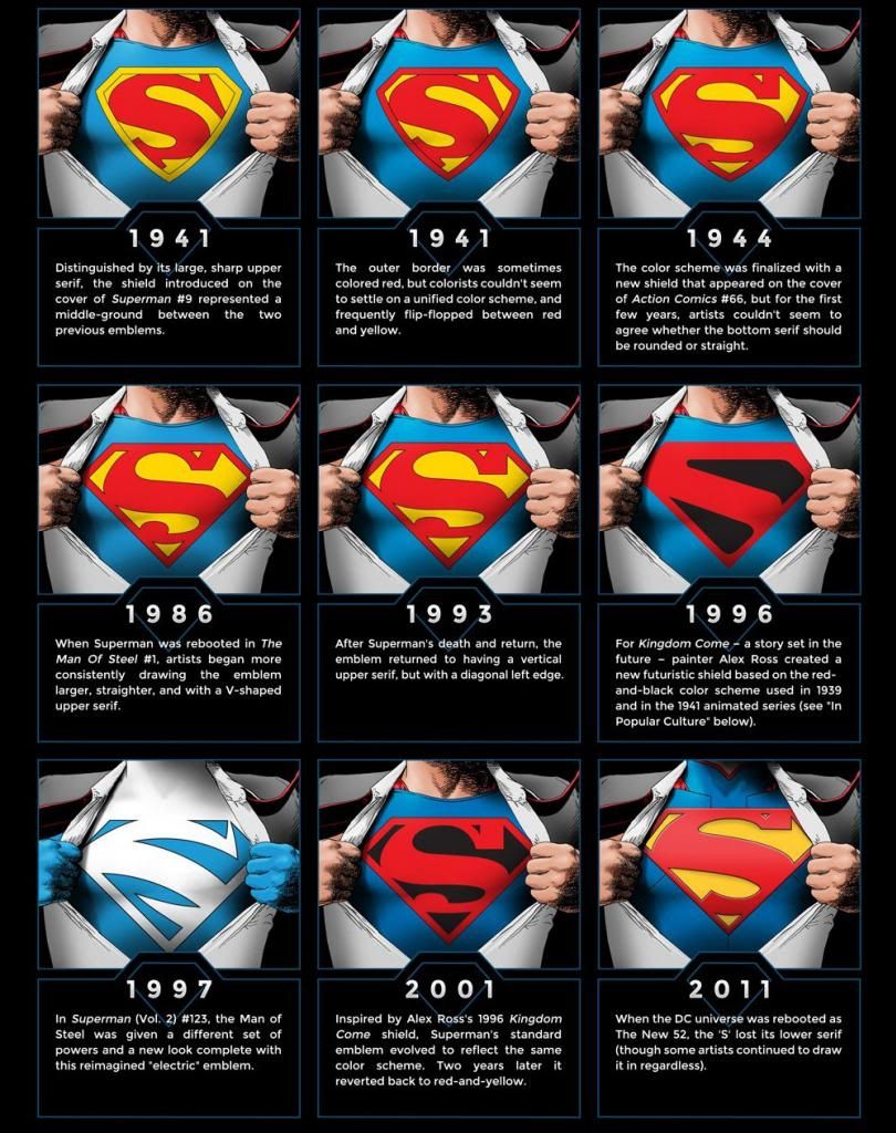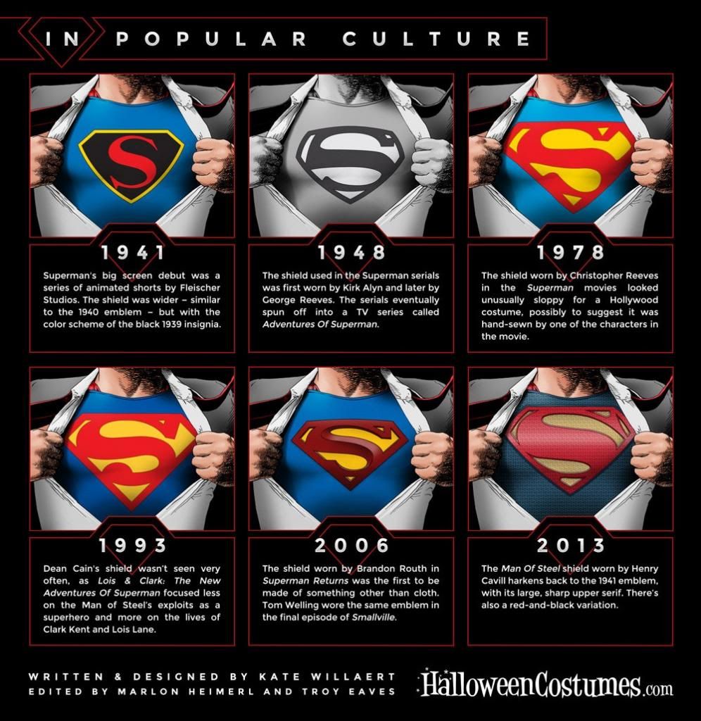 Man of Steel comes out this week, and what better way to prepare than with this awesome Superman shield collection! The infographic was made by Kate Willaert for Halloweencostumes.com. Really? Halloweencostumes.com is into this kind of thing? I have grossly underestimated them. Click the jump to see the whole thing.