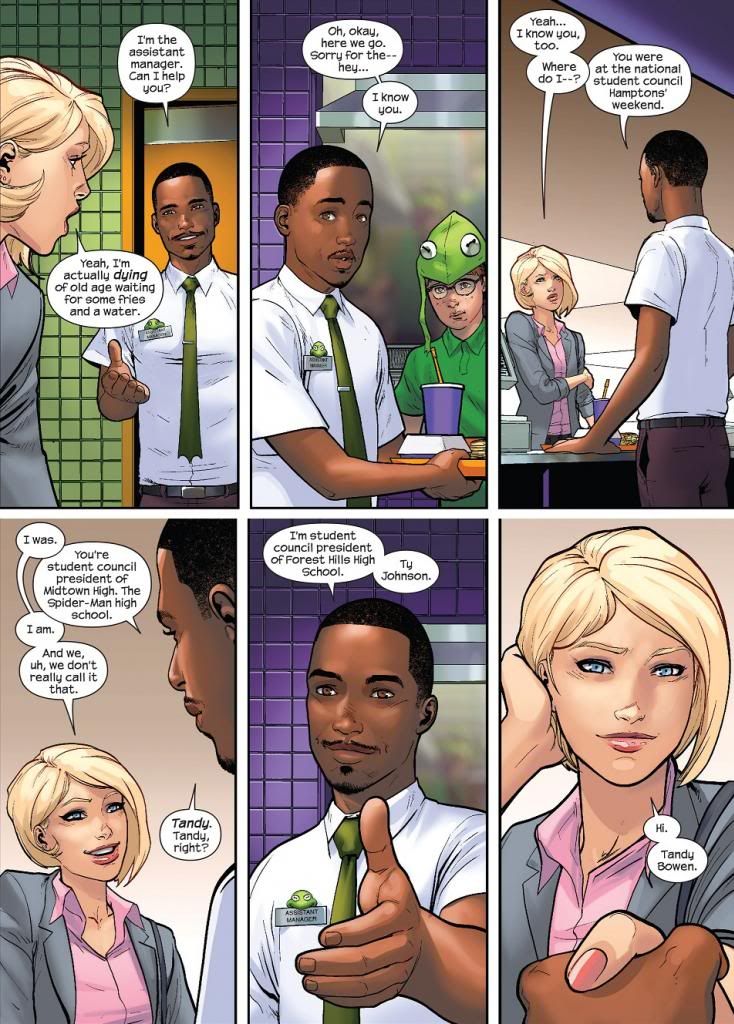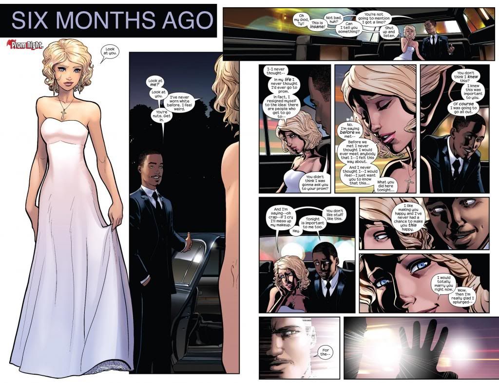 Six months later and Ty and Tandy are going to her prom together. She never thought she’d ever been in such a position, going to prom in a limo, looking gorgeous, and with an amazingly wonderful boyfriend on her arm. It’s picture perfect. And feel free to click the following page to enlarge and read it all. The scene is small but fantastic. This is Bendis at his best.