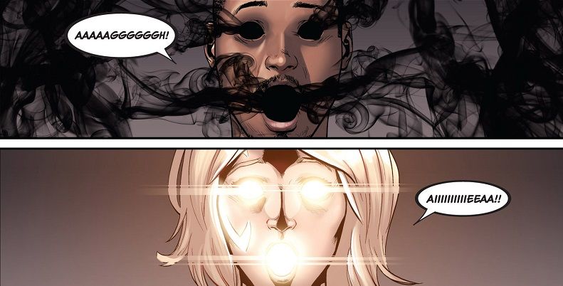 Bombshell mocks Dagger for a bit before Cloak comes up from behind, sucking her into his Dark Dimension. Dagger gets worried and tells Cloak to let her go – but Bombshell saves herself, blowing Cloak open.