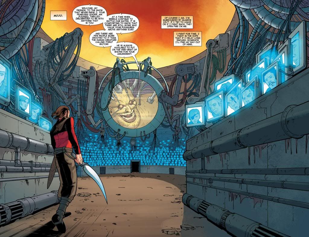 The issue opens with Rictor in a cell. He’s got a beard now, and long hair. Like most superheroes in the Mojoverse, he’s being forced to perform in gladiatorial games for Mojo’s amusement. Rictor says he keeps doing it to bide his time, hoping to find some time to escape. And Mojo is up there on the screen, screeching to his audience about the games. Rictor is not amused.