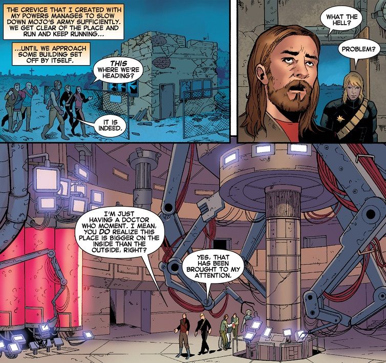 They don’t have time to talk about it before Mojo’s guards show up. Rictor uses his powers to split the arena ground, and the rebels flee, with Shatterstar in tow. They retreat to their secret headquarters, and PAD drops a sweet Doctor Who reference.