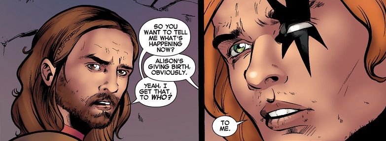 So they’re now also back in time? See what I mean how this story was clearly crammed into one issue? Anyway, Shatterstar grabs Rictor and teleports them forward in time. He doesn’t have much strength, at least not enough to teleport them out of the Mojoverse. They wind up in the same rebel camp, only several years have passed, and the place is in ruins. Rictor hears a woman screaming somewhere in the distance, and he goes to investigate. He finds Dazzler on the floor about to give birth…