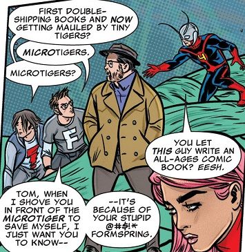 Fraction, Allred and Brevoort meet the FF because they want to turn their adventures into a comic book for Marvel Comics. Because apparently Marvel exists in the Marvel Universe, and they write comics about the superheroes. OK fine. The trio join the FF on a new kiddie ride that Scott Lang has invented where he shrinks kids down for a safari through the microverse. Why he invented this out of the blue instead of going to save the Fantastic Four, like he said at the end of the last issue, is anyone’s guess. So the FF, Leech, Artie and the three creators get shrunk down to the subatomic world, and Fraction pretty much spends the whole issue making fun of himself or teasing Brevoort.
