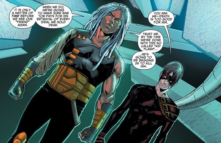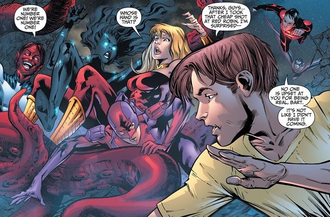 Superboy and Red Robin are the last two to show up, and Superboy delivers the first bit of horrible dialogue after saying that Red Robin is still the boss.