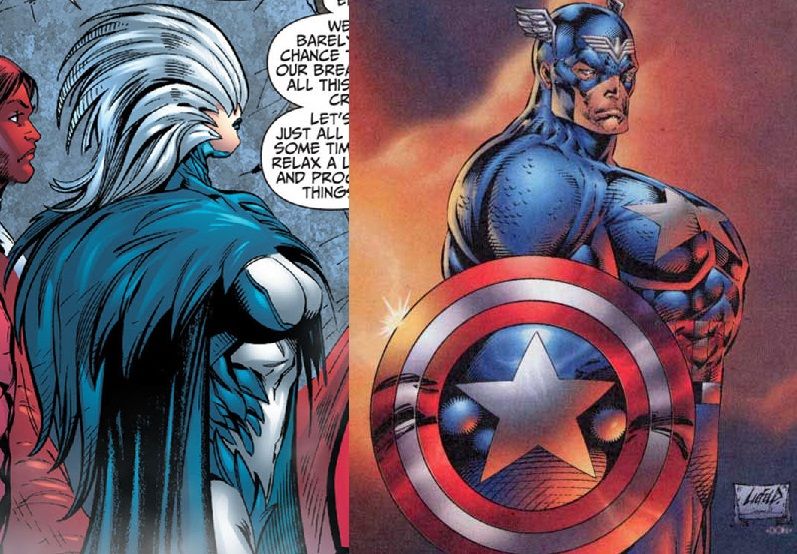 Back in the present, Kid Flash tells everybody that he simply doesn’t remember what he did in the past, and they mostly believe him. Raven is the only one who really doesn’t like trusting Kid Flash, but then not a lot of them trust Raven either. Also, artist Robson Rocha recreates that infamous big-chested Captain America picture