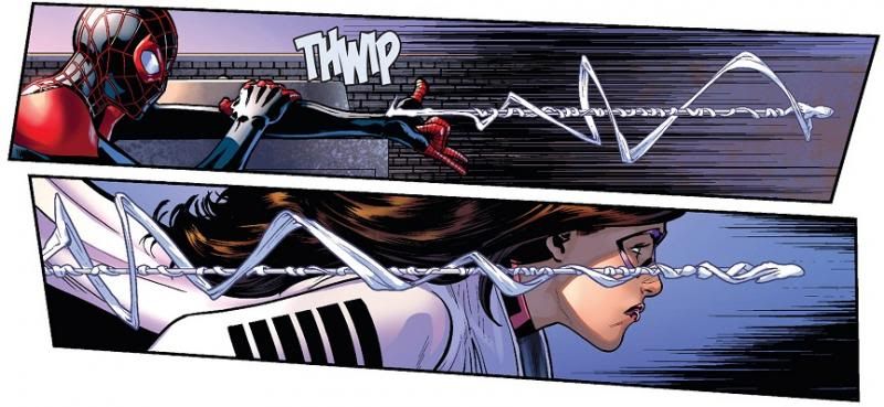 Bombshell panics and explodes, blowing the two of them back. They recover quickly, banter among themselves and swing off after her as she escapes onto the rooftops. But Miles is a little rusty.