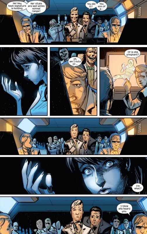 Flash back to 15 years ago again ,and Lana is put into a Roxxon science experiment. They explain they are trying to create the next Captain America, which is part of established Ultimate Universe continuity. It seems everybody was trying to recreate Cap in those days, and I think that’s what led to Spider-Man, the Green Goblin, the Hulk and possibly even mutants.