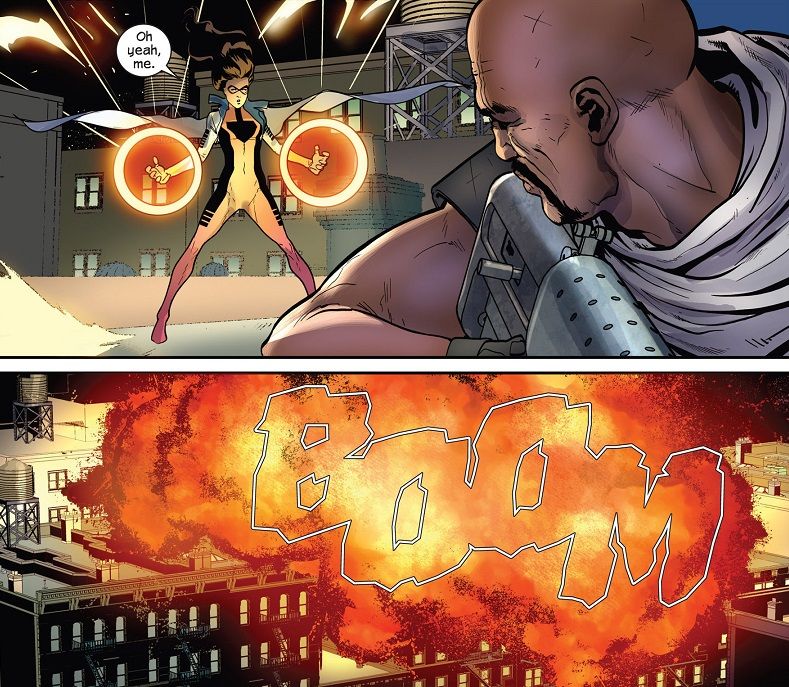 That would have been more awesome if Taskmaster didn’t simply absorb her powers. He survives her attack and readies a blast of his own, but then the Spiders show up and web him from both sides. They pull him back to create some space, but he still explodes – the same large explosion that Cloak and Dagger saw at the beginning.