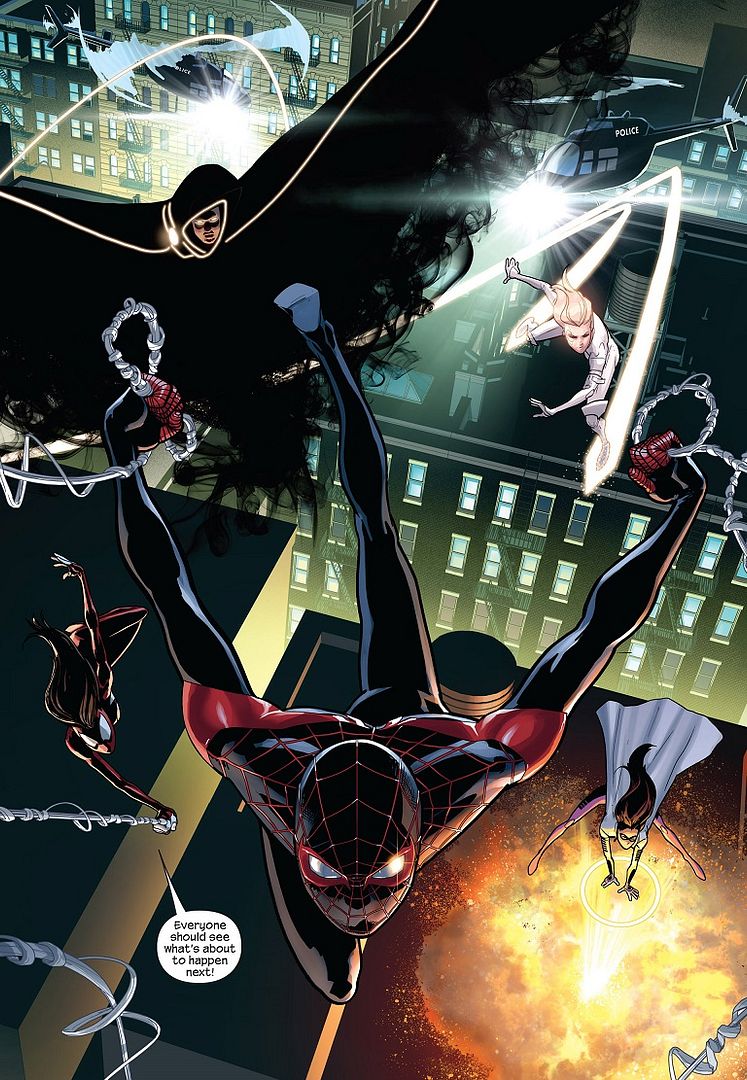 If the end is truly near, I’m a little saddened that this story is so low key. Miles Morales puts the costume back on just to randomly help Cloak and Dagger? Taking on Roxxon feels kind of underwhelming, and I would have to imagine Bendis would have something bigger and better planned if the series was really coming to an end.