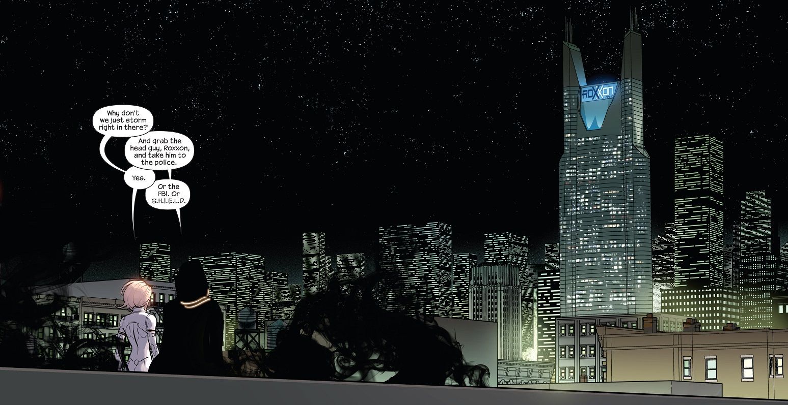 We open with Cloak and Dagger looking up at the Roxxon building, trying to decide their next move.