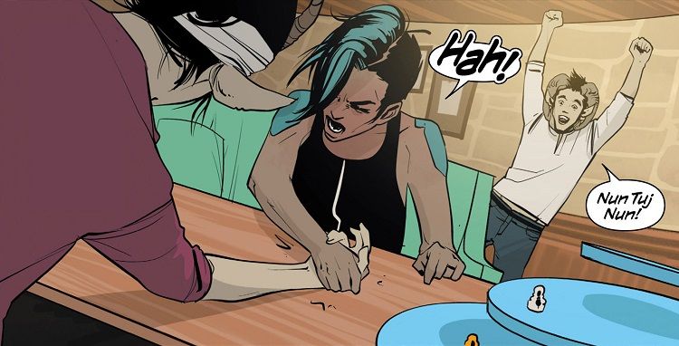 The conversations held between members of Marko and Alana’s family were fun, but mostly they were about moving the story along. Where do they go after Heist? I assume Vaughn has something in mind, but the characters don’t, so we get a few scenes of them talking about leaving Quietus and getting jobs. It’s clearly an important conversation for the characters themselves, but it doesn’t make for that thrilling a narrative – other than the fact that any scenes of this family hanging out are already awesome. Vaughn has created some truly enjoyable characters, so even scenes where they sit around playing board games are fun to read. But overall, this issue is more concerned with smaller scenes, and while that’s not bad, it’s not as powerful as some of Saga‘s bigger themes.