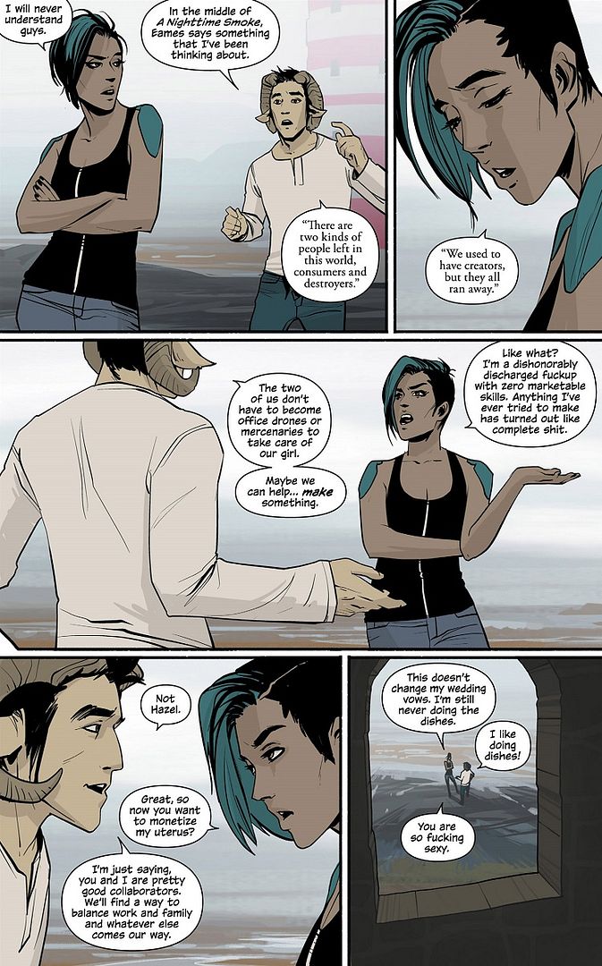 This leads to a discussion about Klara’s views on Alana’s parenting. Klara believes that Alana has become too much of a housewife since arriving on-planet. She’s always doing Marko’s laundry for him, when she should be in the workforce. Heist says he agrees with Klara. He’d love to host them all indefinitely, but that’s not a realistic option. Sooner or later they’re going to have to move on, which means they’re going to have to get jobs to support themselves. Alana thinks he’s being hypocritical, because she thought the entire point of his book was to convince people to just sit back and hang out – though Heist disagrees. Even Marko tries to make the point that they can’t just sit back on the rocketship tree and never show Hazel the big, wide universe.