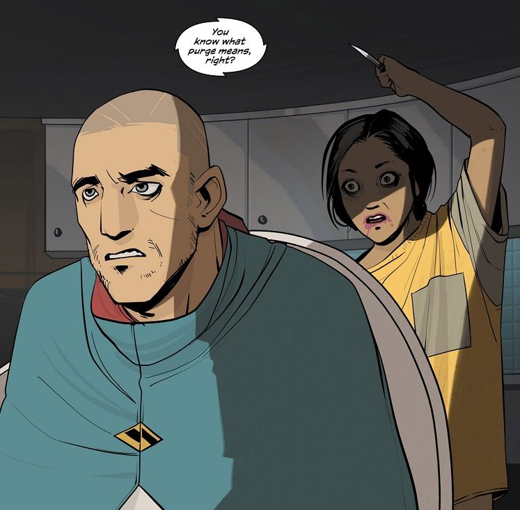 Psychotic Sophie stabs The Will in the neck. He stumbles out of his chair and falls onto the floor. Then we see the hallucination standing above her, telling Sophie to stand on his neck until he stops moving. We also see that this hallucination was not only Sophie’s mother, but also The Stalk visions that The Will has been seeing for several issues.